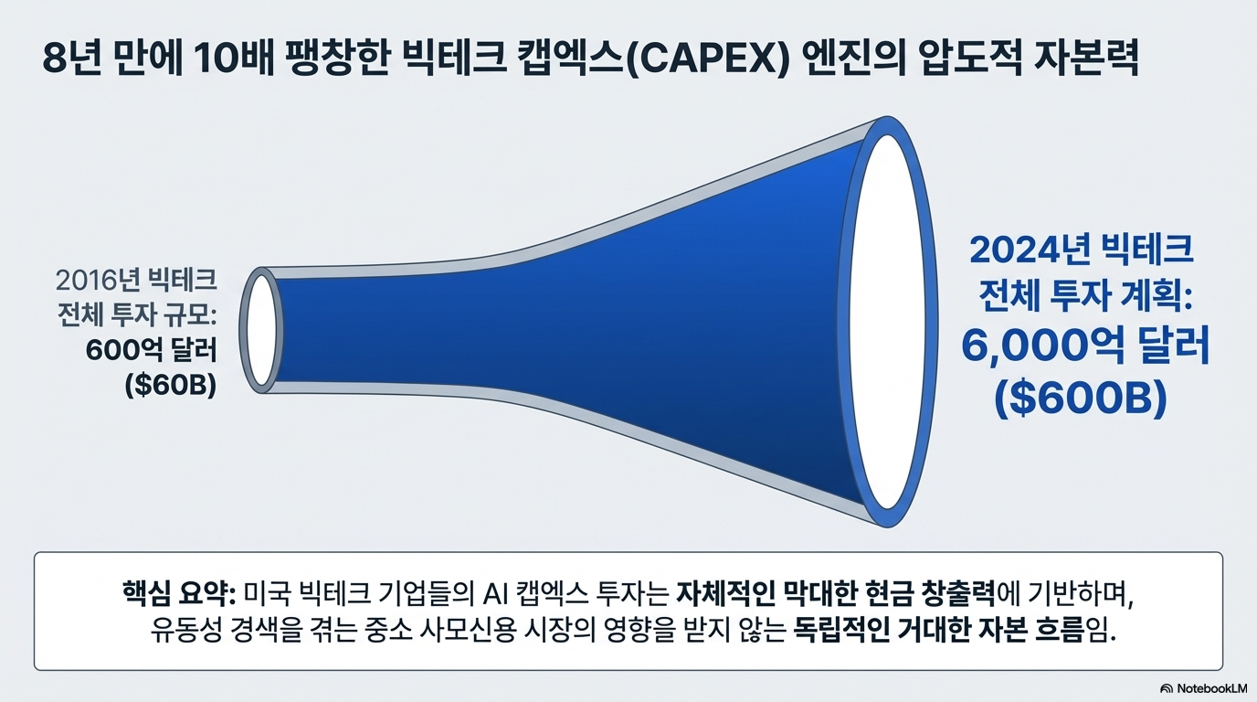 AI ๋ฐ ๊ตญ๋ด ์ฆ์ ์ํฅ: ์ผ์ฑ์ ์์ SKํ์ด๋์ค์ ์ฃผ๊ฐ ๋๋ ฅ์ธ ๋ฏธ๊ตญ ๋น ํ ํฌ ๊ธฐ์ ์ ์ค๋นํฌ์(CAPEX) ๊ท๋ชจ๋ 2016๋ 600์ต ๋ฌ๋ฌ์์ 2024๋ 6,000์ต ๋ฌ๋ฌ๋ก 10๋ฐฐ ์ฑ์ฅํ์ต๋๋ค. ์ฌ๋ชจ์ ์ฉ ์ด์๊ฐ ์ด๋ฌํ ๊ตฌ์กฐ์ AI ์ฌ์ดํด์ ์ ํดํ ๊ฐ๋ฅ์ฑ์ ํฌ๋ฐํฉ๋๋ค.