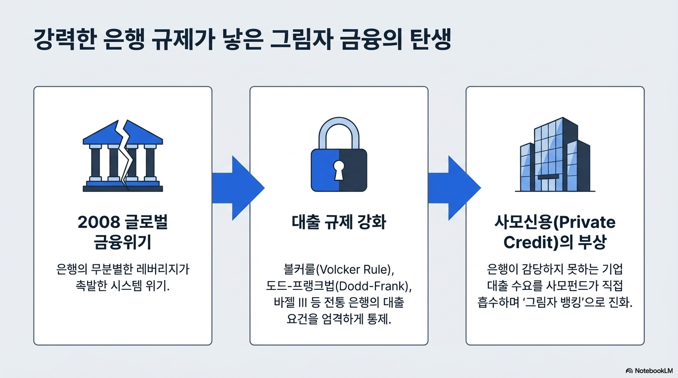 ๋ ๋ณผ์ปค ๋ฃฐ(Volcker Rule), ๋๋-ํ๋ญํฌ๋ฒ(Dodd-Frank Act), ๋ฐ์ ค III ๊ท์ ๋ฑ์ผ๋ก ์ธํด ์ ํต์ ์ธ ์ํ์ ๋์ถ ๊ท์ ๊ฐ ๊ฐํ๋๋ฉด์ ๊ทธ ํ์๋ฅผ ์ฌ๋ชจ์ ์ฉ์ด ๋ฉ์ฐ๋ฉฐ ๊ธ์ฑ์ฅํ์ต๋๋ค.