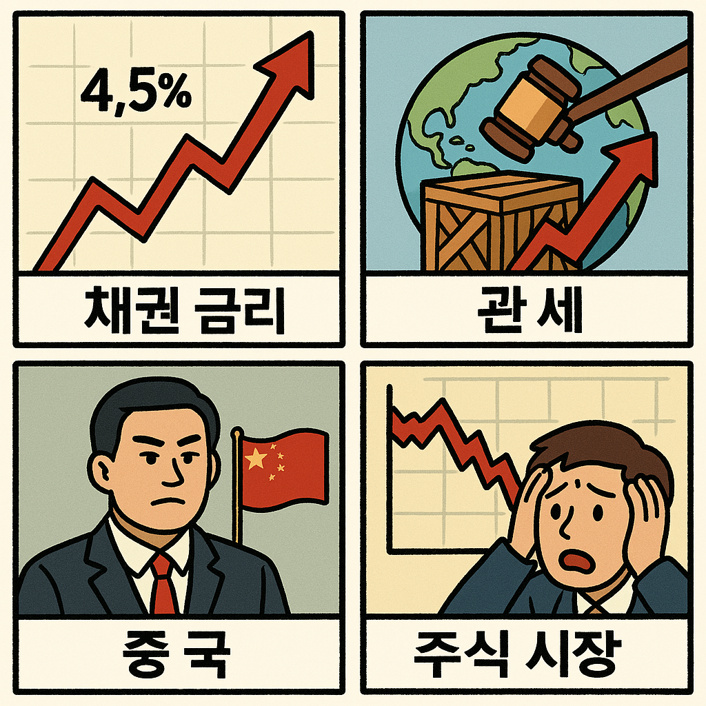 • ์ฑ„๊ถŒ ๊ธˆ๋ฆฌ ๊ธ‰๋“ฑ: ๋ฏธ๊ตญ 10๋…„๋ฌผ 4.5% ๋ŒํŒŒ, ์ค‘๊ตญ์˜ ๋ฏธ๊ตญ ๊ตญ์ฑ„ ๋งค๋„์„ค