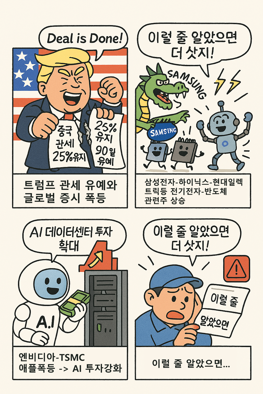 1. ๊ด€์„ธ ์œ ์˜ˆ ํŠธ๋Ÿผํ”„, ์ค‘๊ตญ ์ œ์™ธ ๊ธ€๋กœ๋ฒŒ ๊ด€์„ธ 90์ผ ์œ ์˜ˆ ๋ฐœํ‘œ → ์‹œ์žฅ ๊ธ‰๋“ฑ ํŠธ๋ฆฌ๊ฑฐ